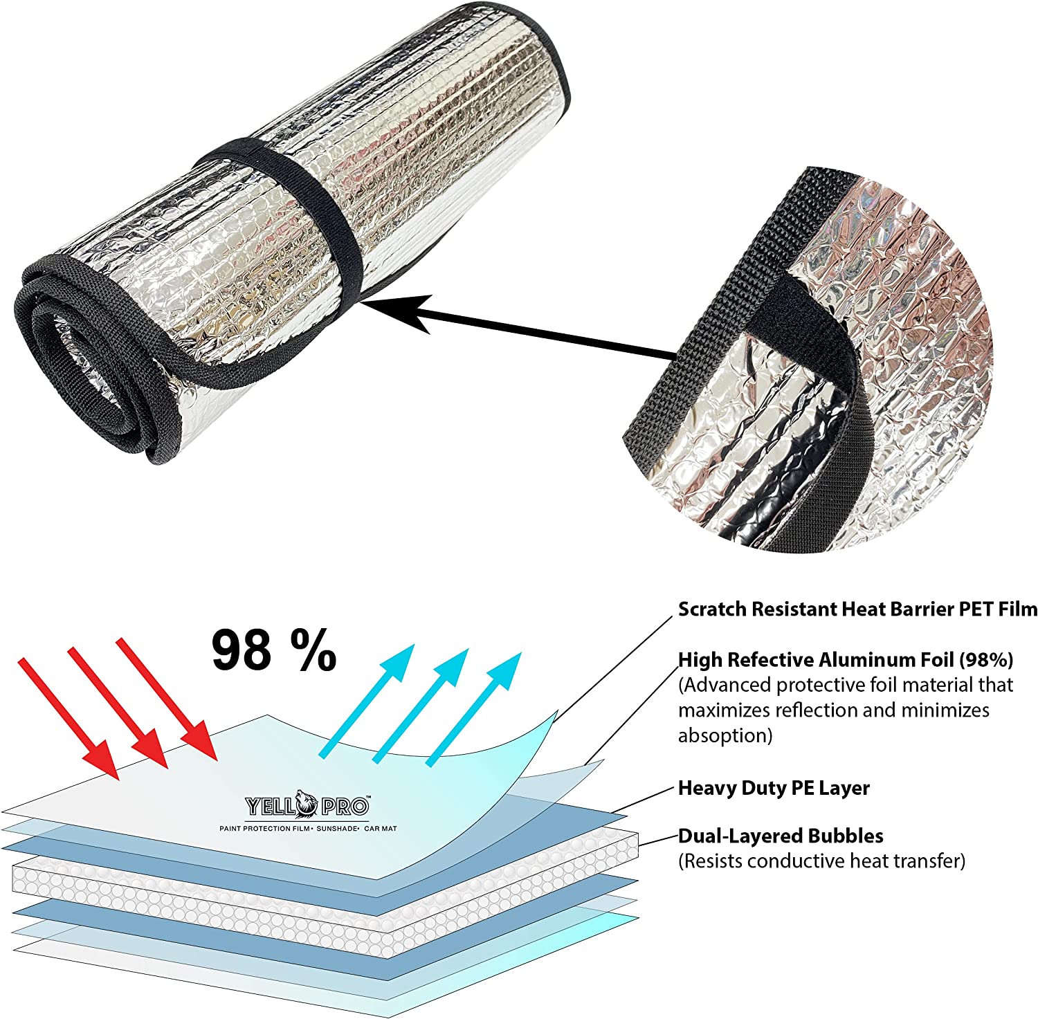 - Reflects up to 98% of incoming solar light. Lightweight rolls-up sunshade design.